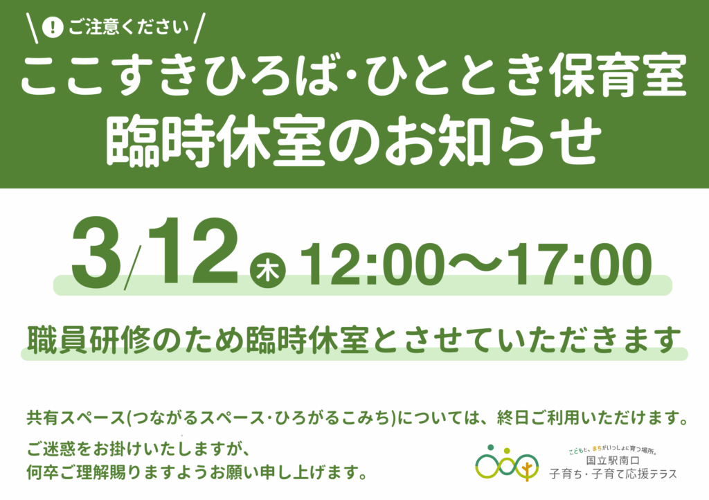 ここすきひろば・ひととき保育室は職員研修のため、下記の日時は臨時休室とさせていただきます。